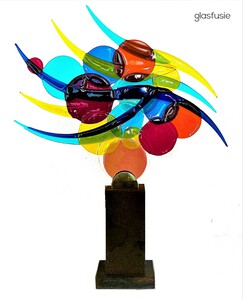 2020ronde vormen bewegen in, uit, over en naast elkaar, dit kleurrijk object kan zowel hangen als staan. In het voorbeeld op een voet van steen.
